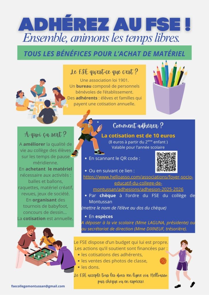 L’Association « F.S.E. du collège de Montussan » est enfin créée et les élèves et les parents qui le souhaitent vont pouvoir y adhérer pour la somme de 10 euros.